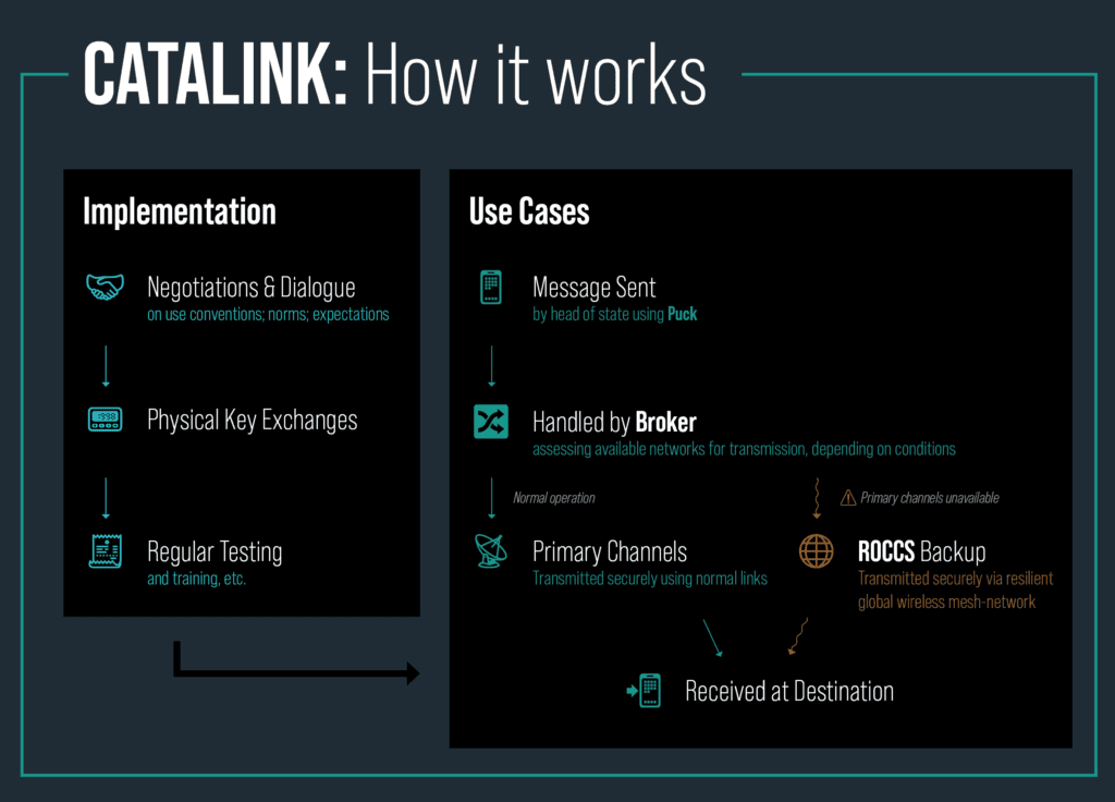 The system ⁠consists of an endpoint device called a Puck that rides on a global mesh-network called the ROCCS⁠. The CATALINK would build on the “hotline” model of previous generations, and rely on internationally driven open-source technologies to maximize user integrity and trust. It would exploit redundant transmission capabilities to ensure that multiple parties could connect under extreme conditions, including loss of power and the absence of cellular and/or internet connectivity. Endpoint devices would be designed for durability, availability, and ease of use, enabling parties to immediately connect with confidence amid crises. These endpoint devices would also be secure: the firmware, software, and hardware would all meet cutting edge world class requirements for security. Looking for examples of how to build international consensus around this concept, we took inspiration from the process that led to the creation of the National Institute of Standard and Technology Advanced Encryption Standard (NIST AES). To ensure the integrity and validity of the technical solution, we are building a community of passionate global citizens from varying professional backgrounds.